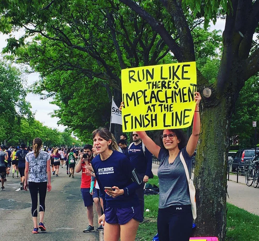 Kara (holding the sign) near the end of this year's Brooklyn Half Marathon. The promise of impeachment might actually motivate us to run next year!